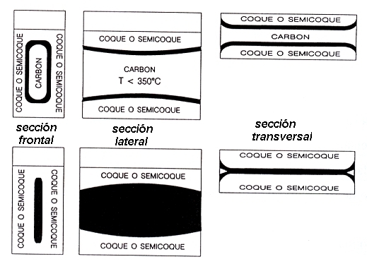 Es conocido que al calentar los carbones coquizables en atmósfera inerte, pasan por un estado plástico en un intervalo de temperaturas que oscila entre 350 ºC y 500 ºC, dependiendo del tipo de carbón. Dentro del horno existirán, por lo tanto, dos zonas plásticas que tienden a desplazarse perpendicularmente a la dirección de calentamiento y hacia el centro del horno a medida que progresa la coquización. Además, dado que tanto la solera como la bóveda del horno son también superficies calientes, aparecerán otras dos zonas plásticas secundarias, que se desplazan en dirección vertical.